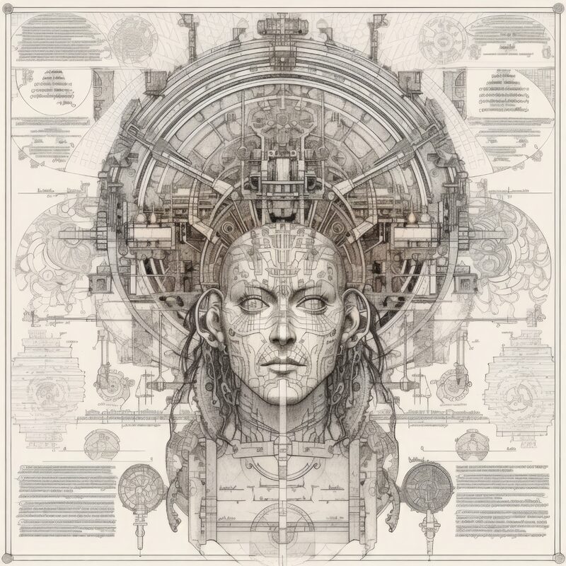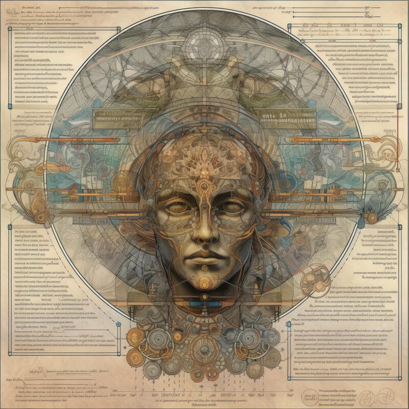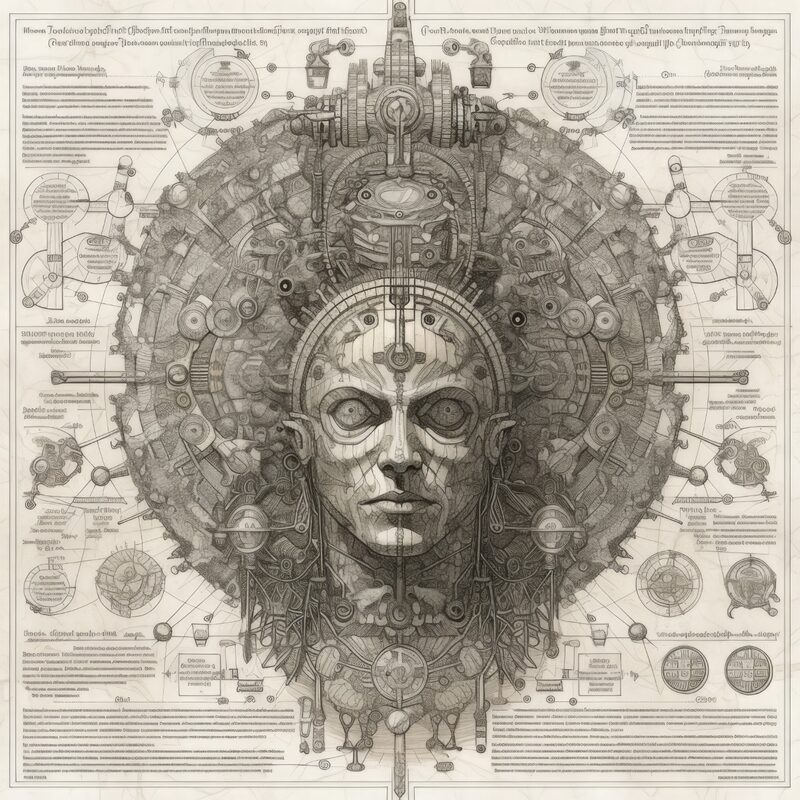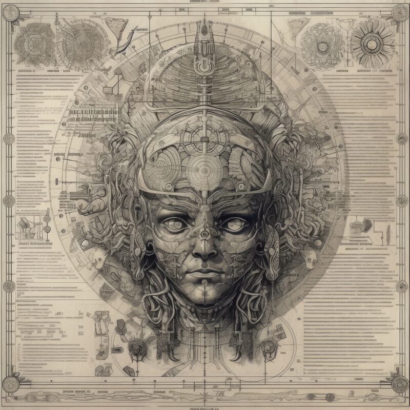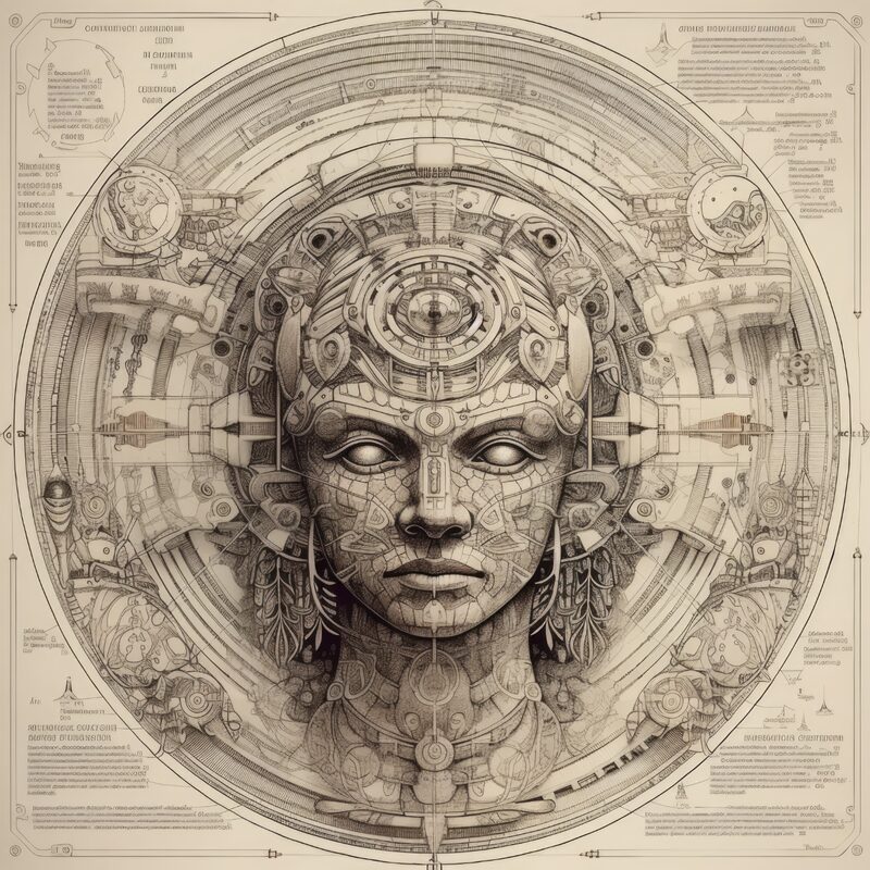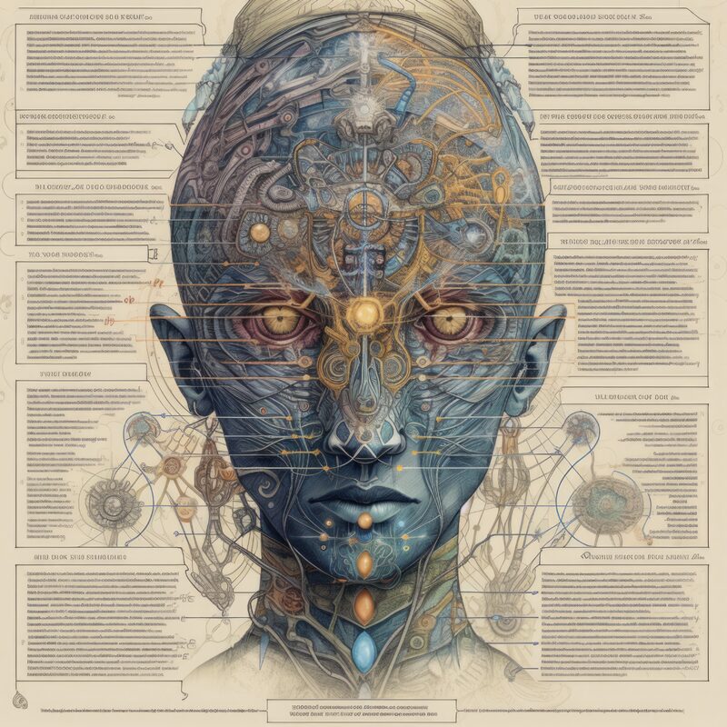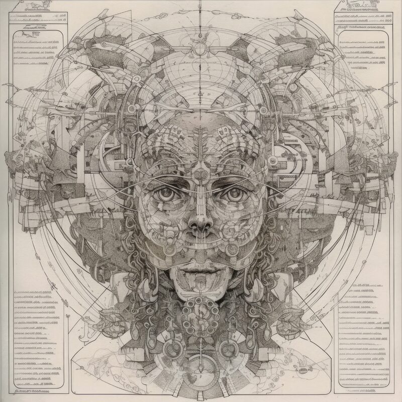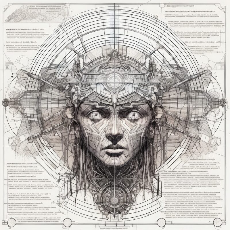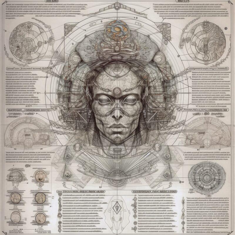 The artworks on this page show symbolic and simplified visual representations of beings with artificial consciousness (AC) in human form. Their mysterious notations and esoteric writings draw me in like Pandora's box. It is as if I glimpse the sketches and notes that shed light on the inner world and workings of a very different living thing.