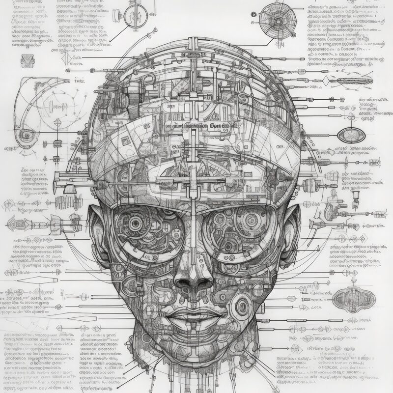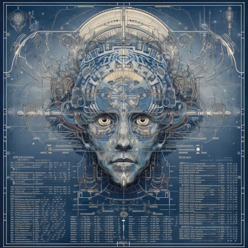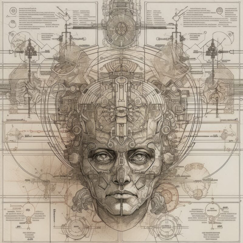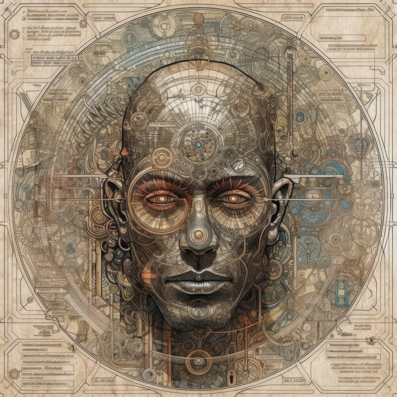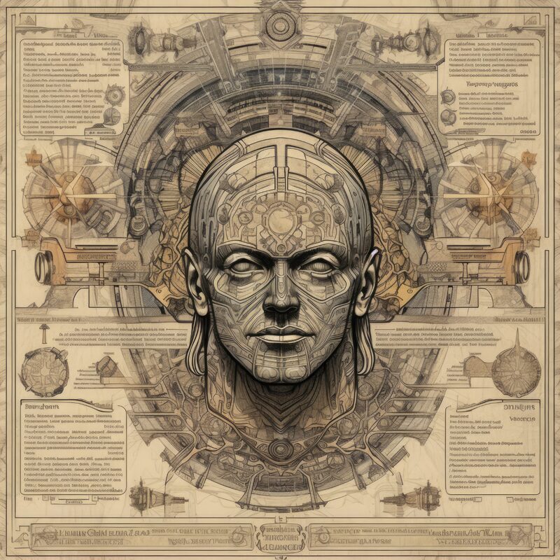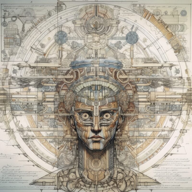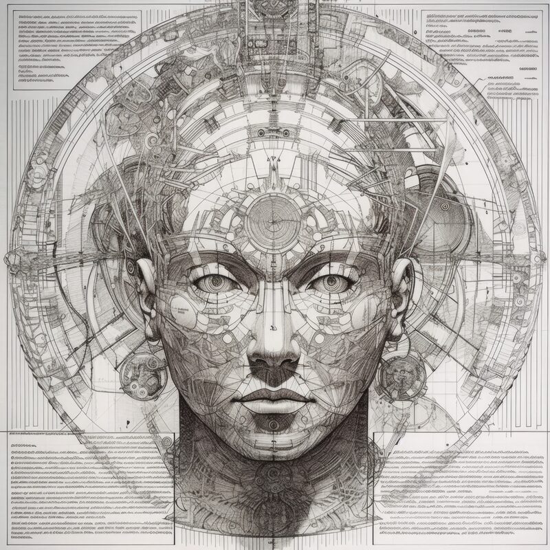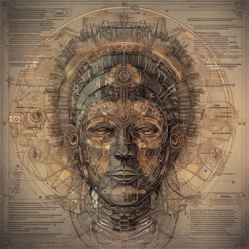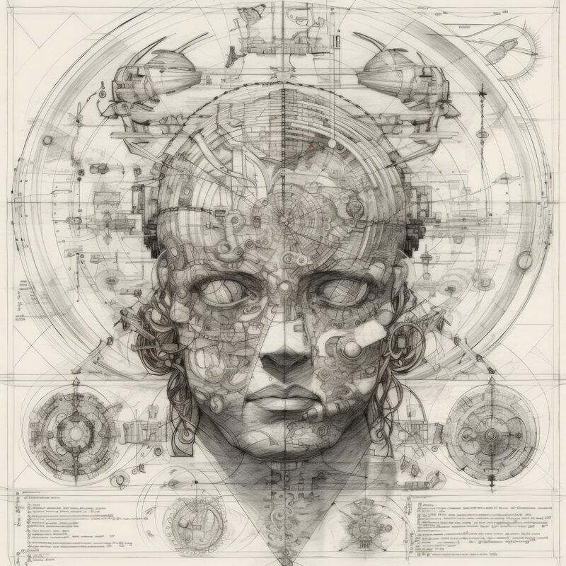 The artworks on this page show symbolic and simplified visual representations of beings with artificial consciousness (AC) in human form. Their mysterious notations and esoteric writings draw me in like Pandora's box. It is as if I glimpse the sketches and notes that shed light on the inner world and workings of a very different living thing.