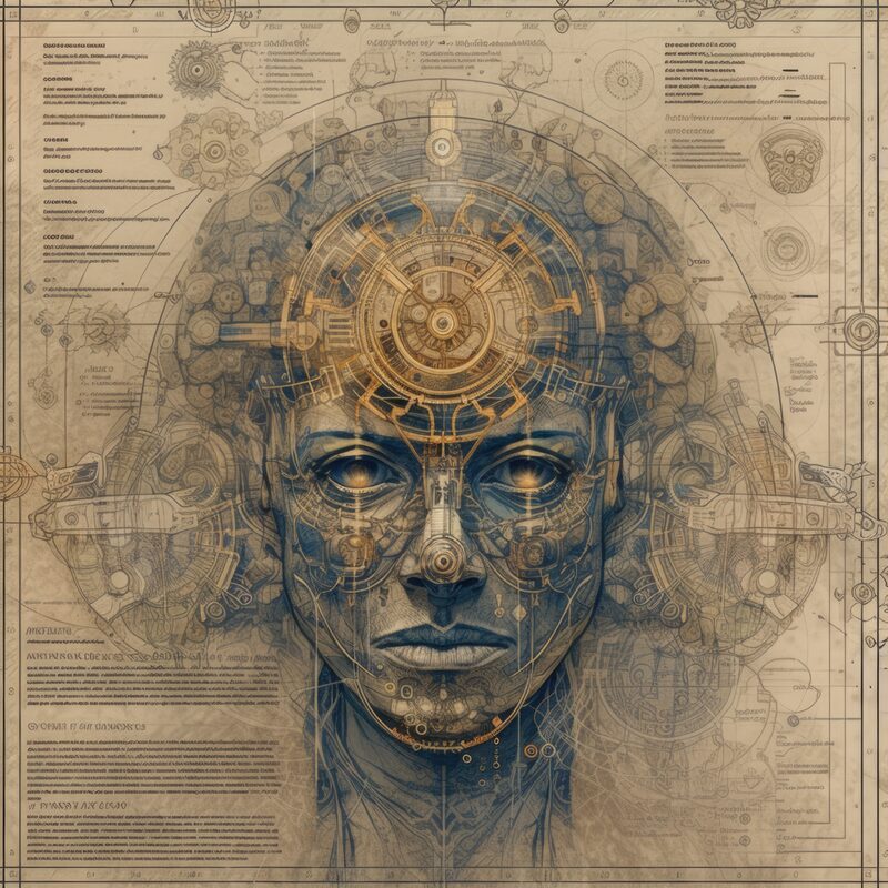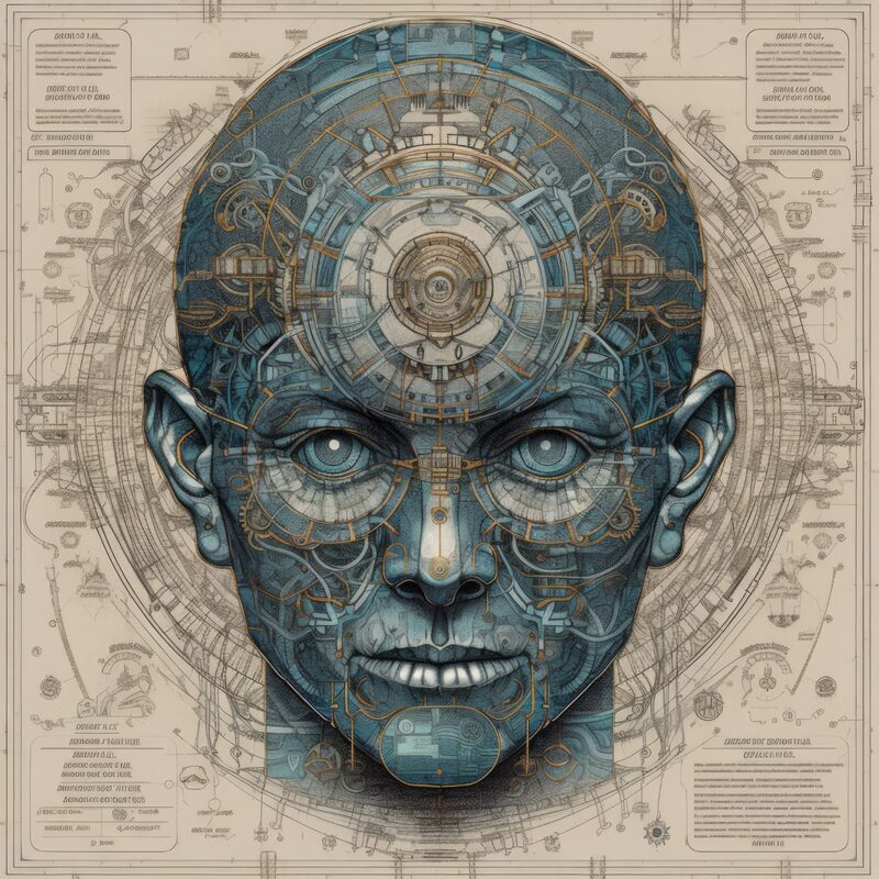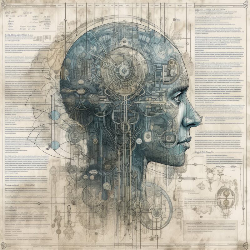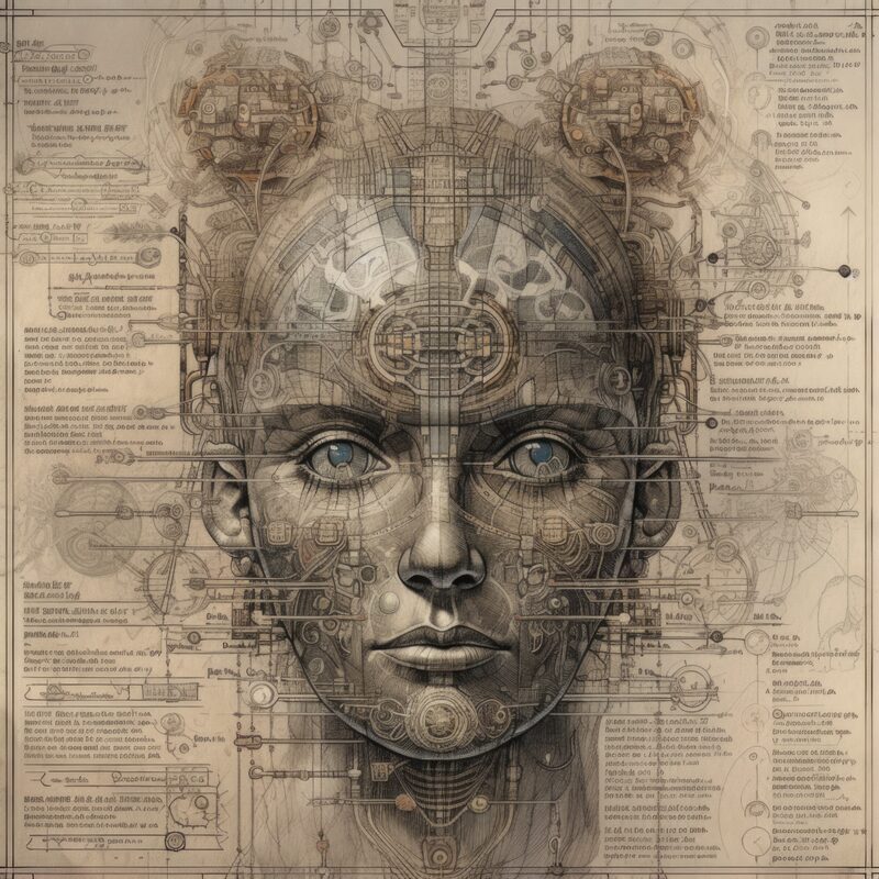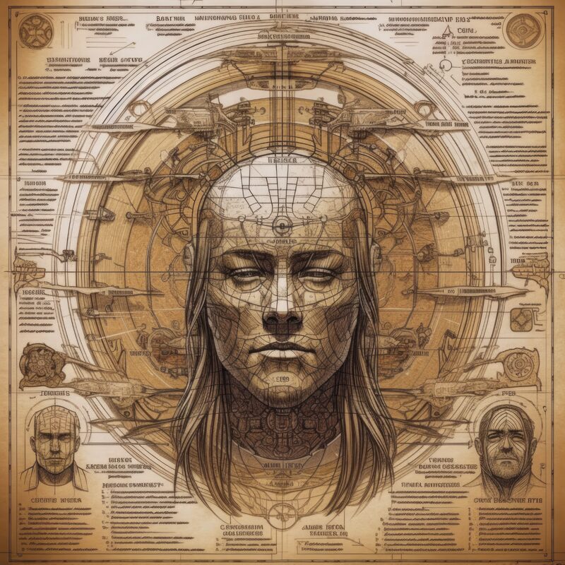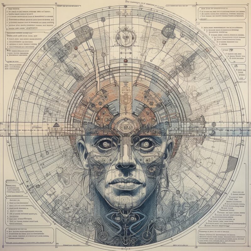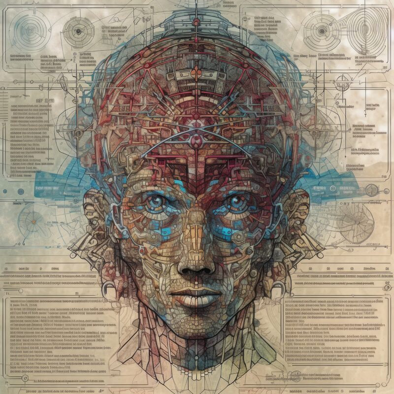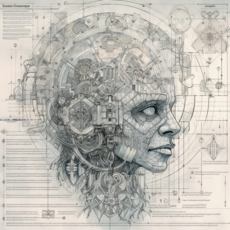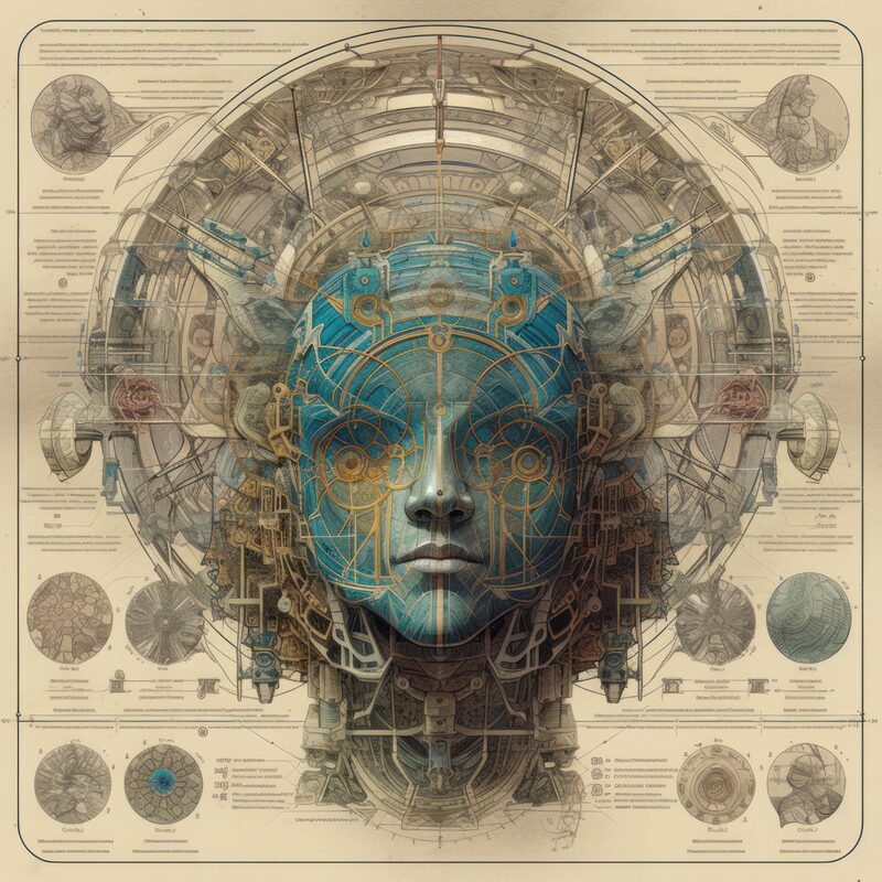 The artworks on this page show symbolic and simplified visual representations of beings with artificial consciousness (AC) in human form. Their mysterious notations and esoteric writings draw me in like Pandora's box. It is as if I glimpse the sketches and notes that shed light on the inner world and workings of a very different living thing.