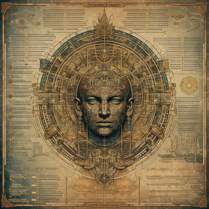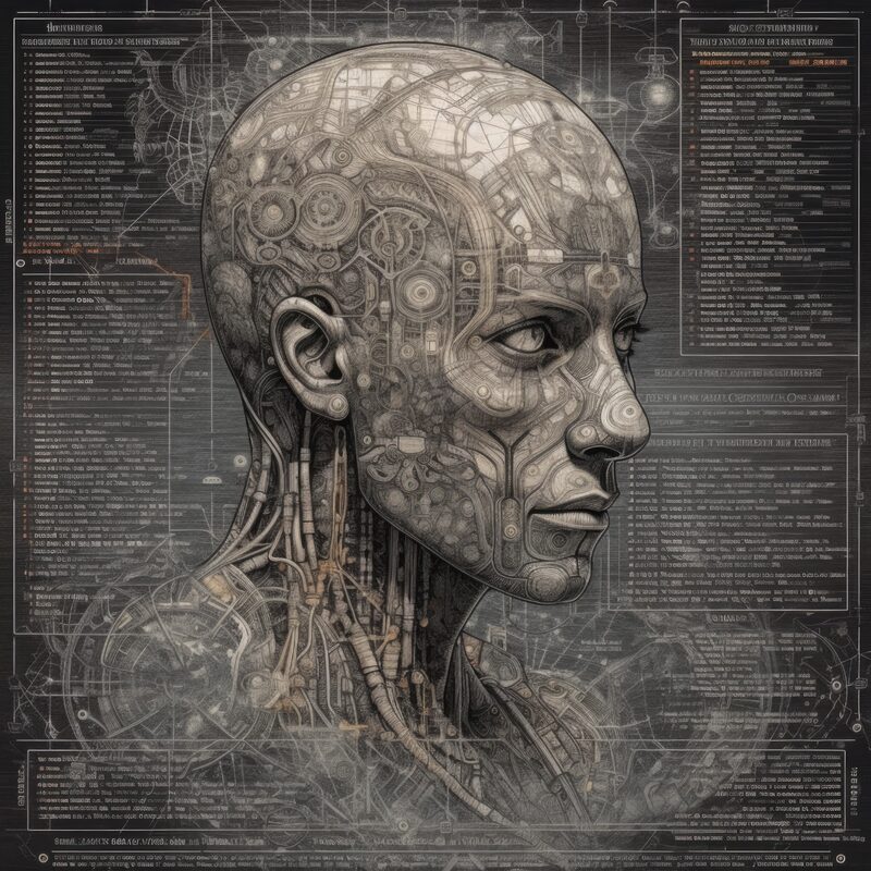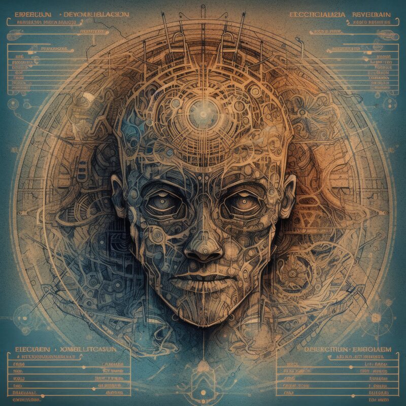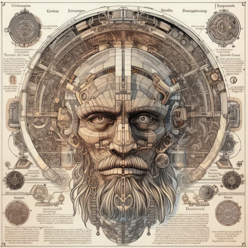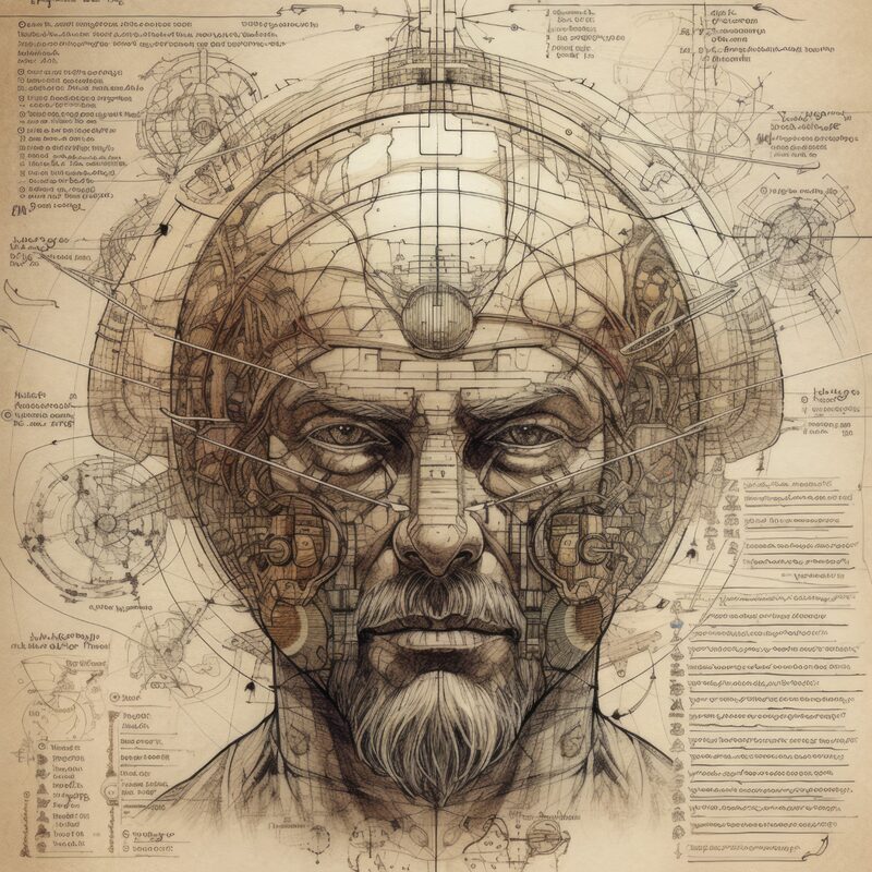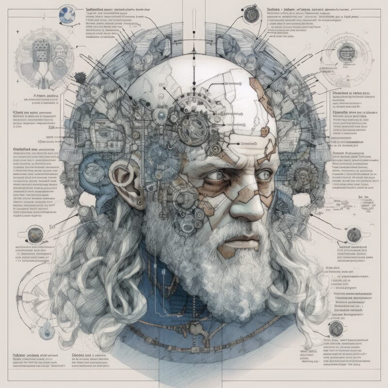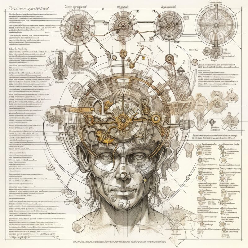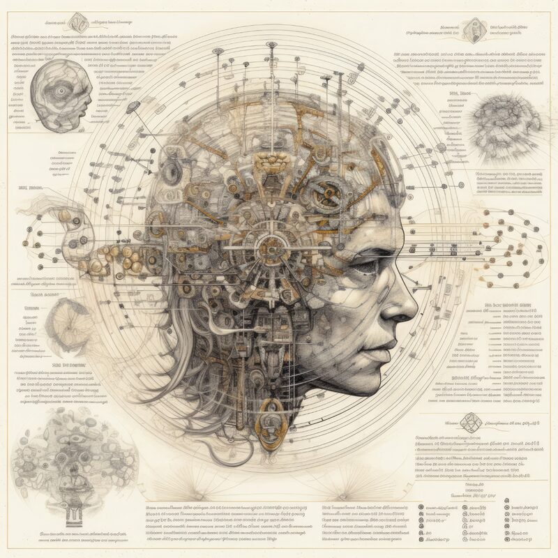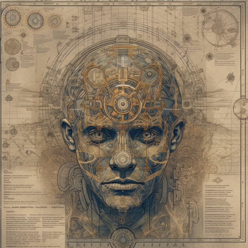 The artworks on this page show symbolic and simplified visual representations of beings with artificial consciousness (AC) in human form. Their mysterious notations and esoteric writings draw me in like Pandora's box. It is as if I glimpse the sketches and notes that shed light on the inner world and workings of a very different living thing.